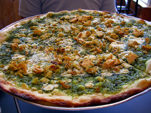 Mozzarella, chicken, pesto basil, chunk tomatoes, olive oil, seasonings